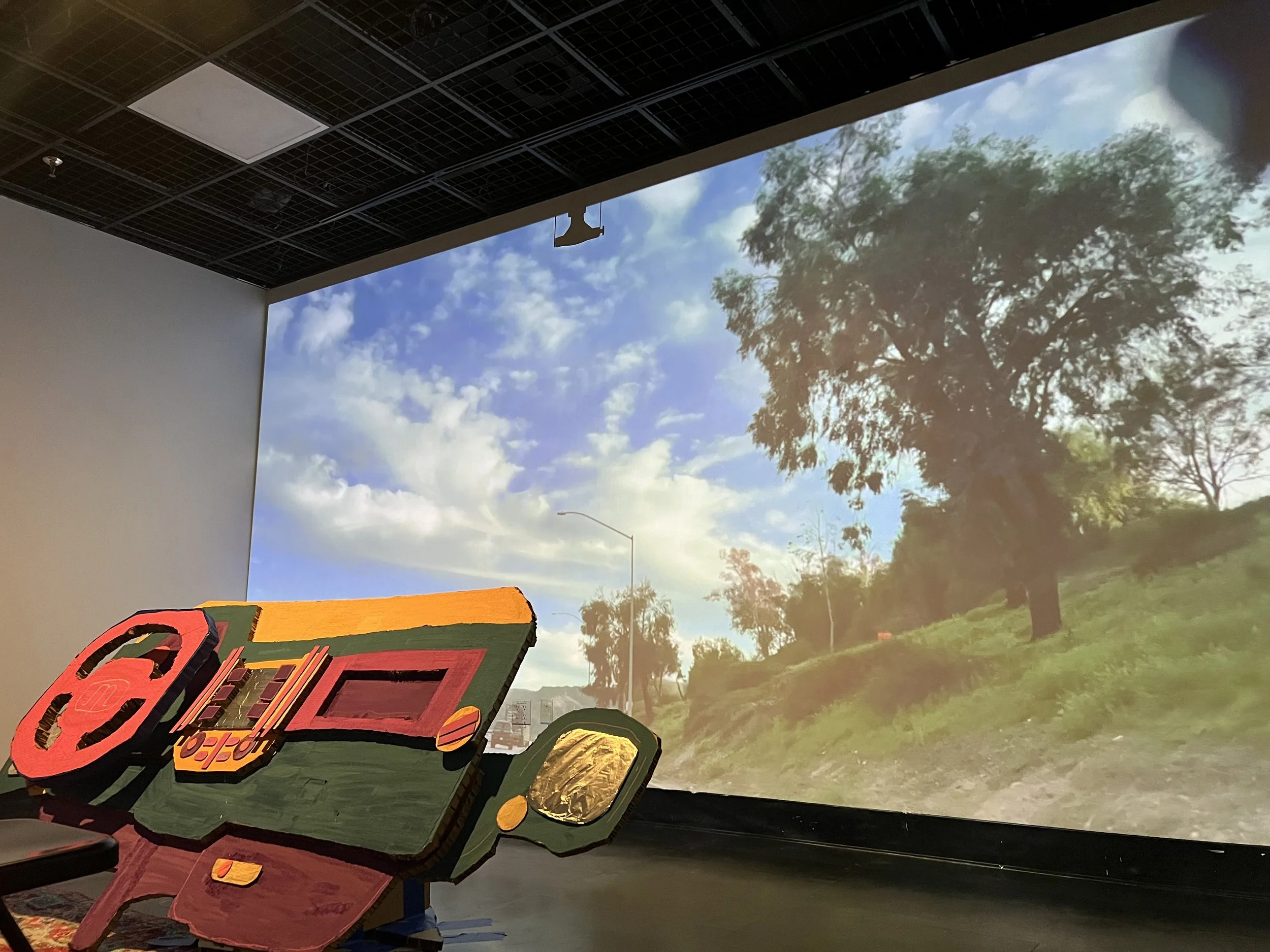 This installation in the WaveCave aimed to create a traveling environment with an original playlist of songs and sounds, footage of driving, and a handmade stylized car interior. The tracks were added to throughout the week by anyone who wanted to record into the project, so there were more sounds and musical moments by the end of the week long installation.